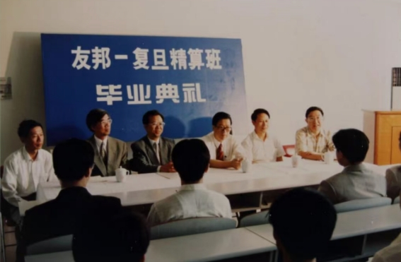 这是一张摄于上世纪90年代的老照片,纪录下盟邦与复旦大学合营创立“盟邦-复旦精算班”后的刹那,故事也从照片中的小方桌讲起。